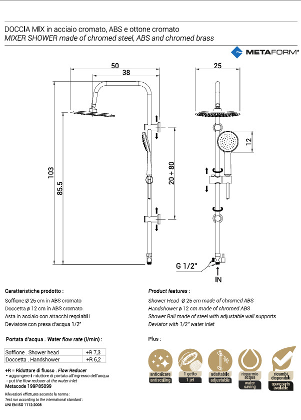 Il soffione da 25 cm, garantisce un ampio getto d'acqua, effetto pioggia rilassante. La distanza degli attacchi a muro è regolabile fino a 80 cm, consentendo un'estrema adattabilità e la possibilità di coprire fori pre-esistenti. Cursore a pulsante che rende la regolazione della doccetta semplice e immediata. I flessibili realizzati in PVC, materiale resistente all'ossidazione e facile da pulire.
