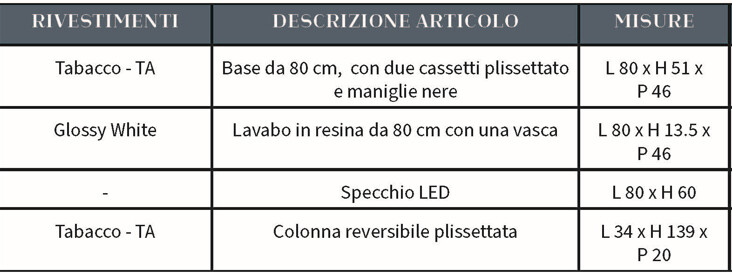Il tuo ordine verrà preparato e affidato al corriere entro i giorni lavorativi indicati, a partire dalla data di conferma dell'ordine. Riceverai un numero di tracciamento per monitorare lo stato della spedizione.Questo set bagno si distingue per uno stile raffinato e moderno, valorizzato da una finitura effetto legno Tabacco e da una lavorazione plissettata verticale che dona profondità e movimento alle superfici. Il risultato è un arredo dal forte impatto estetico, capace di rendere l’ambiente caldo, accogliente e ricercato.