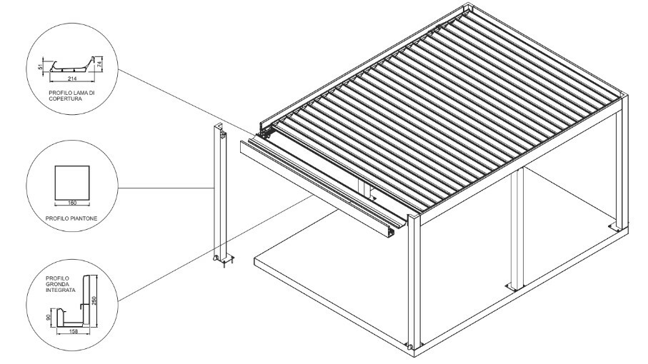 - Gronda integrata nelle lame (il tettuccio orientabile) e nei piantoni;