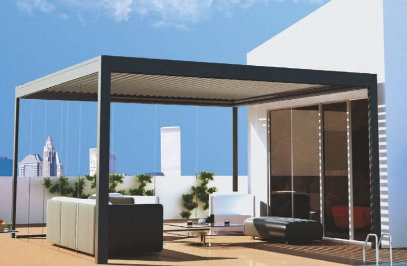 Il tettuccio della pergola è composto da lame in alluminio estruso orientabili fino a 120° e ciò permette il passaggio dei raggi solari e del vento, utile qualora venga corredata perimetralmente da tende Cristal o vetrate scorrevoli per un maggior riciclo d'aria.